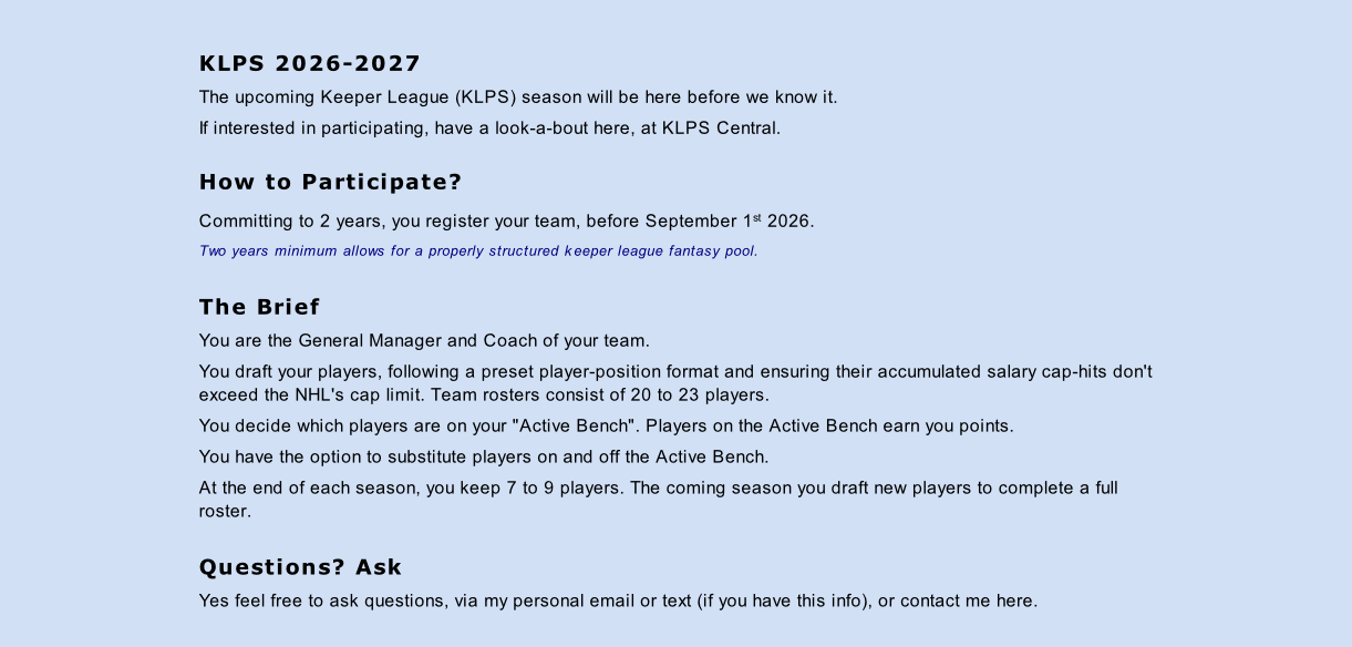 KLPS Central - Keeper League Pool Select 2026-27