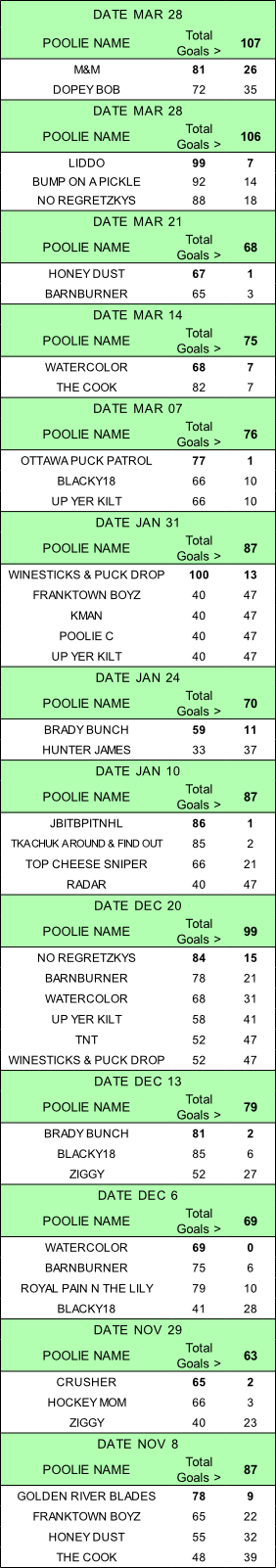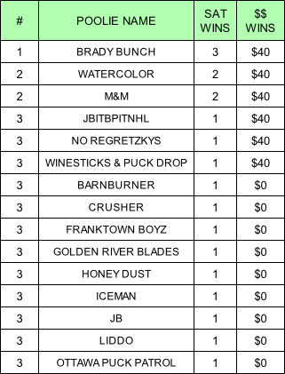 Tie-Breaker: used to confirm ea Saturday’s winner (total goals for the related Sat)