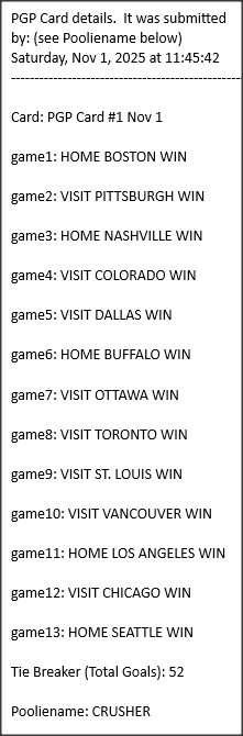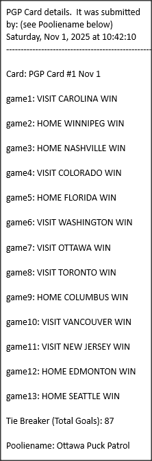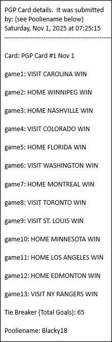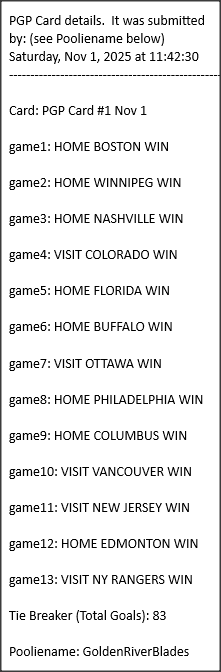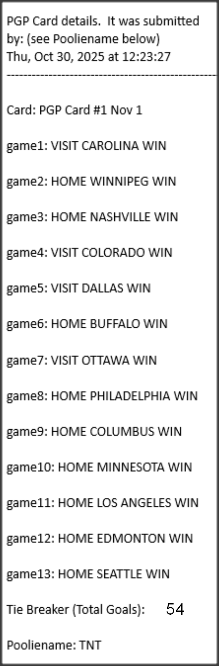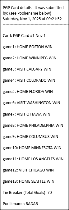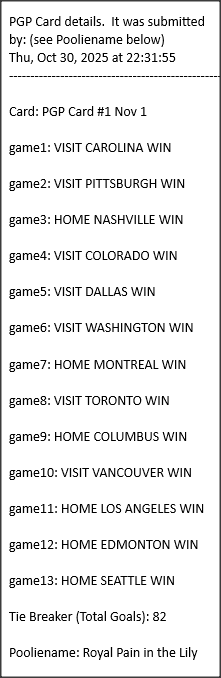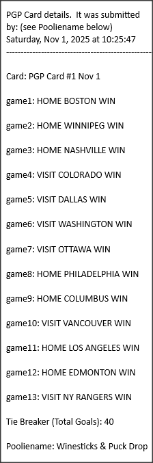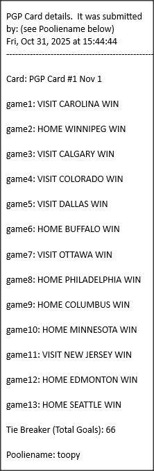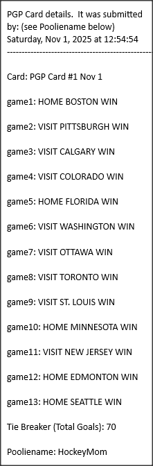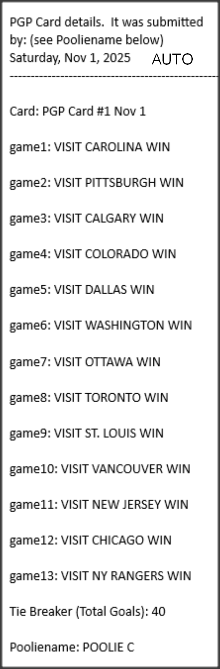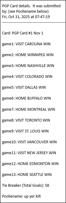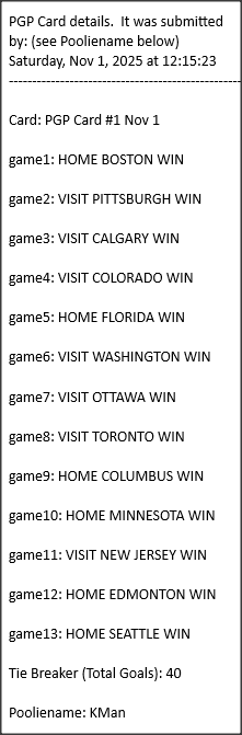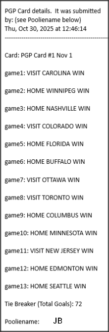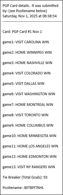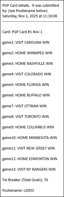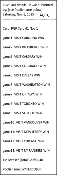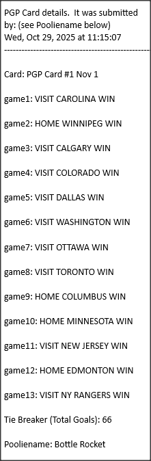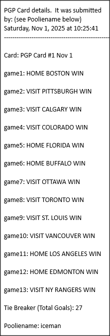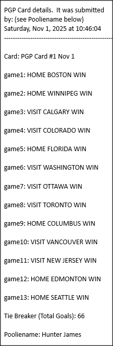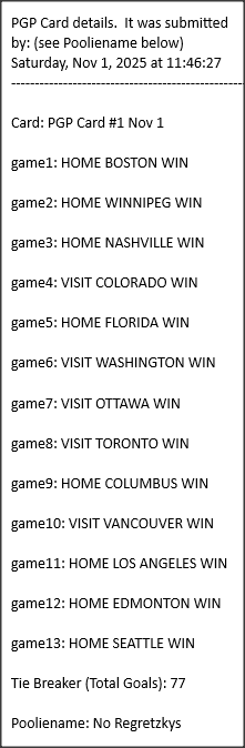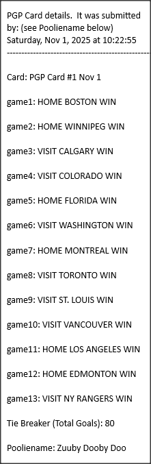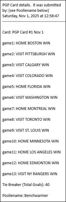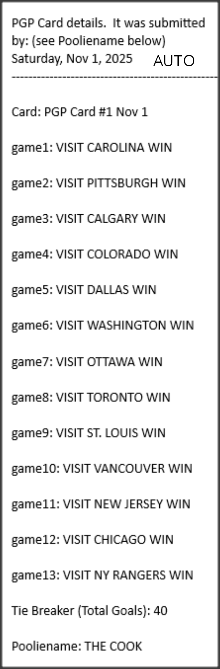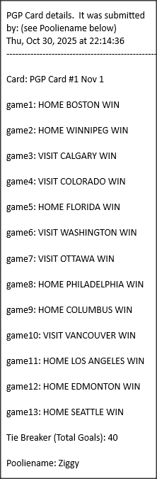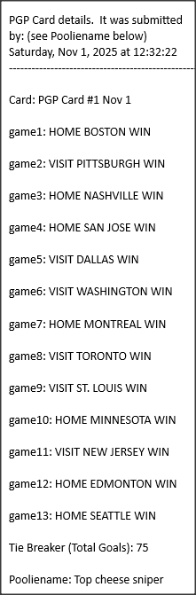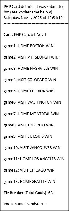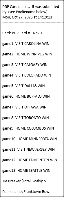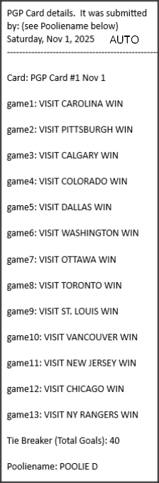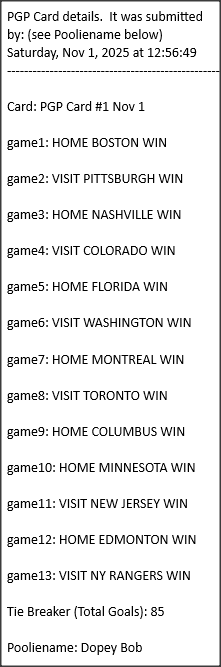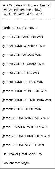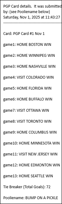 Poolies picks are uploaded/posted here below, Saturdays between ~1:00 pm & ~1:15 pm. Note… each with a date/time stamp.